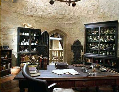 Professor Quirinus Quirrell nutzte dieses Büro in seiner Amtszeit als Lehrer in Verteidigung gegen die dunklen Künste im Schuljahr 1991-1992. An den Wänden hingen Stammesmasken aus Afrika, an der langen Wandseite ein großes Bücherregal, auf dem nicht nur Bücher, sondern auch Gegenstände, die Schädelknochen sein könnten. Zum Fenster war ein Teleskop aufgestellt, auf dem boden lagen Turbane und Kissen verstreut.[8]