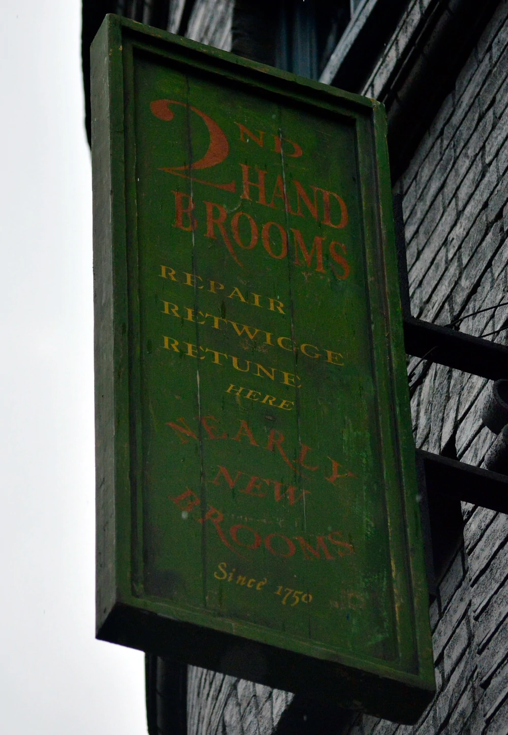 Dieses Geschäft in der Winkelgasse verkauft gebrauchte Besen.[1] Es wurde 1750 gegründet. Nach dem Reklameschild über der Tür werden gebrauchte Besen erneuert wie neu, indem sie repariert werden, der Besenreisig erneuert und verbessert wird sowie die Flugeigenschaften modernisiert, aufgerüstet wird ( Engl. retuning ). Das Geschäft wirbt mit "Fast wie neu ( Engl. nearly new Brooms )
