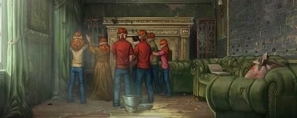 - „Eine halbe Stunde später traten Harry und Ron … in den Salon, einem langen Raum im ersten Stock mit hoher Decke und olivgrünen Wänden, an denen schmutzige Tapeten hingen. Der Teppich atmete jedes Mal, wenn man mit dem Fuß auftrat, kleine Staubwolken aus, und die langen, moosgrünen Vorhänge summten, als wären sie voll unsichtbarer Bienenschwärme.“