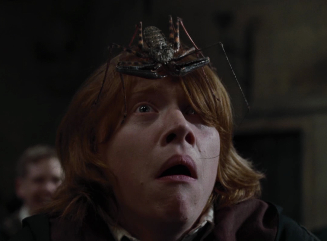 Barty Crouch Jr., disfrazado como Alastor Moody, le enseñó a sus alumnos de Defensa Contra las Artes Oscuras de cuarto año el uso de las Maldiciones Imperdonables, realizando una de cada una de las tres maldiciones en una de cada una de las tres arañas.[14] En 1995, el trío encontró arañas del tamaño de platillos en una cómoda en el comedor del número 12 de Grimmauld Place, con Ron saliendo de la habitación para preparar una taza de té y no regresó hasta que se fueron, debido a su ya mencionada aracnofobia.[15]