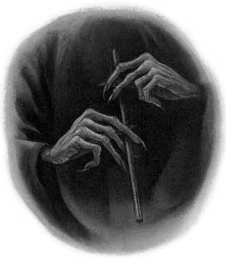 Lord Voldemort sujetando la Varita de Saúco.