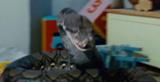 Luego sintió un gran dolor en la cicatriz y una voz fría dijo "retenlo". Bathilda entonces llevó a Harry a una mesa desordenada y, después de una distracción en la que le señalo a la ropa sucia de la masa (que Harry analizó en busca de un signo de la espada de Gryffindor), se reveló a sí misma como Nagini, la serpiente de Voldemort. Nagini luego salió del cuerpo de la anciana y, antes de que Harry pudiera usar cualquier hechizo, ella le mordió el antebrazo, e hizo que su varita volara por el aire. A continuación, lo tiró al suelo y comenzó a enrollarse a sí misma en torno a él para mantener a Harry en ese lugar. Sin embargo, Hermione escuchó ruidos desde abajo y corrió escaleras arriba, obligando a la serpiente a soltar a Harry.