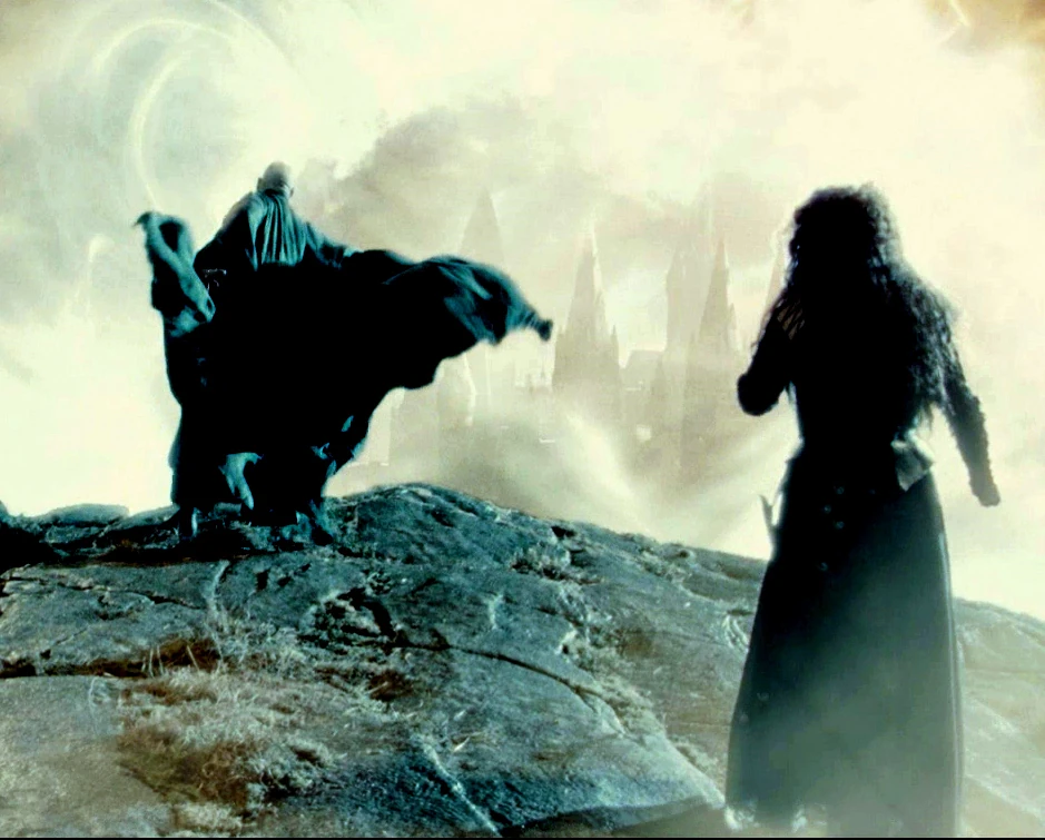 Bellatrix y Voldemort durante la Batalla de Hogwarts.