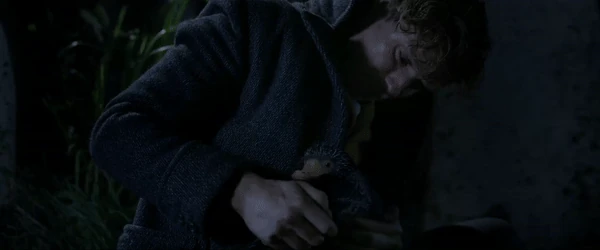 - «El escarbato va renqueando hasta NEWT, que lo levanta del suelo… y entonces ve que sujeta el frasco de GRINDELWALD con sus patitas. Coge el colgante, asombrado. NEWT se guarda el frasco y al escarbato dentro del abrigo.»