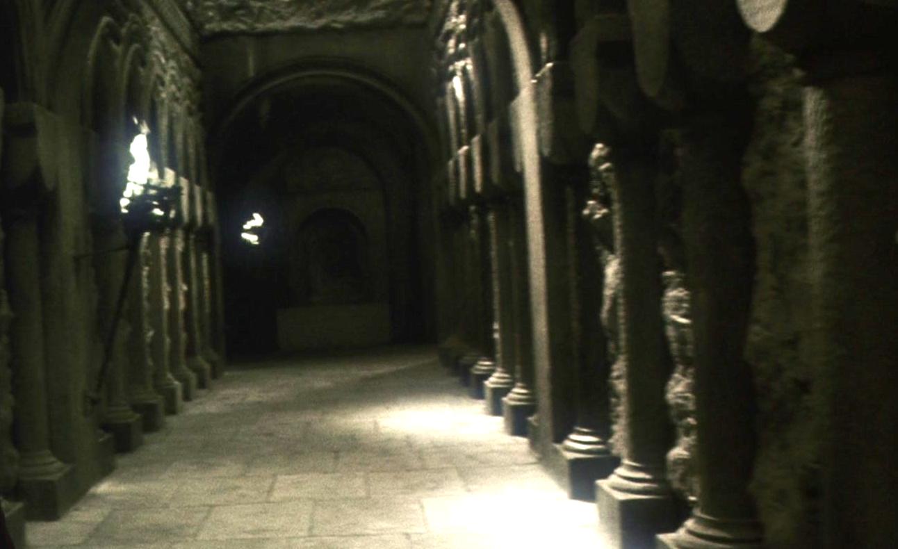 El corredor de las mazmorras es un corredor largo y algo triste que lleva desde la escalera de Pociones, viniendo desde la entrada del viaducto, a las escaleras que llevan abajo al muro de piedra blanca en donde está la entrada a las mazmorras de Slytherin. El aula de Pociones, y posiblemente el despacho de Severus Snape, pueden ser encontrados en este corredor. Los corredores de Slytherin son probablemente adyacentes a este corredor.