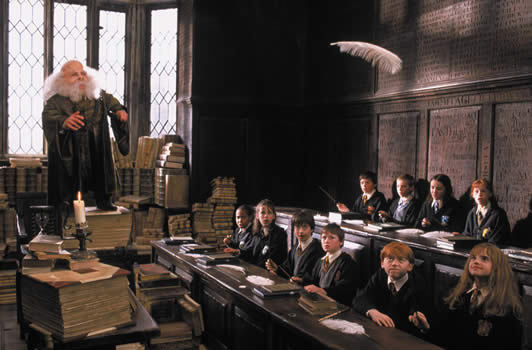 El profesor Flitwick fue uno de los maestros más amables en Hogwarts. Harry Potter, Ron Weasley y Hermione Granger a menudo disfrutaban de una buena conversación en esta clase. Esta fue la clase en la que también usaron el encantamiento muffliato.[8] Harry estaba en buenos términos con el profesor Flitwick ya que el profesor habló con Harry sobre el "perfecto" encantamiento convocador que utilizó en el Torneo de los Tres Magos. A veces, el profesor Flitwick, después de intentar y no conseguir que su clase se concentre, les permitía jugar. Uno de estos casos fue justo antes del Baile de Navidad.[9]