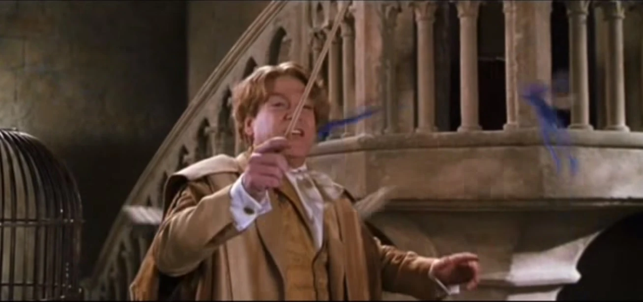 Gilderoy Lockhart intentando usar el hechizo Peskipiksi pesternomi sobre unos duendecillos de Cornualles, sin éxito.