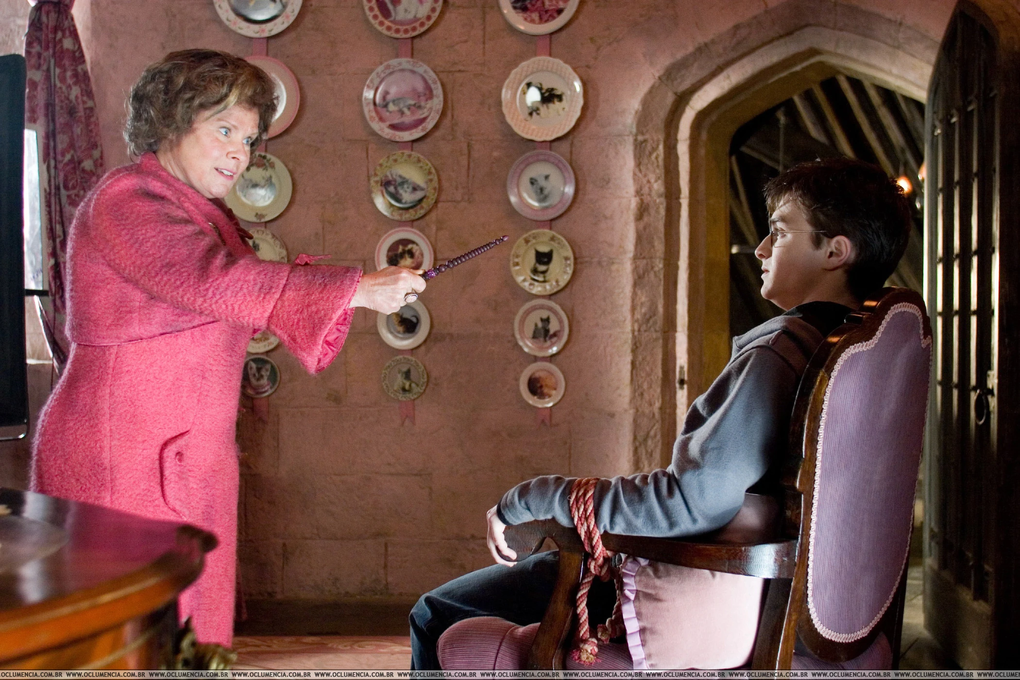 Umbridge dispuesta a realizar la maldición Cruciatus en Harry Potter in 1996.