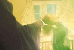 Lord Voldemort lanzando la maldición asesina durante su duelo con Albus Dumbledore.