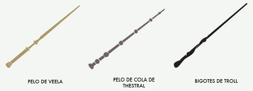- Cabe señalar que, con respecto a las varitas del Trío (Harry, Ron y Hermione), cada varita tiene uno de los tres núcleos diferentes utilizados por Ollivander: la varita de Harry tiene una pluma de fénix, las varitas de Ron (tanto la primera como la segunda) tiene un pelo de cola de unicornio y las varitas de Hermione (tanto la de ella como las de Bellatrix) tienen fibra de corazón de Dragón.