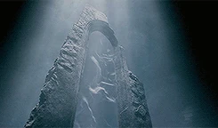 - «En el centro del foso, sin embargo, en lugar de la silla con cadenas había una tarima de piedra sobre la que se alzaba un arco, asimismo de piedra, que parecía tan antiguo, resquebrajado y a punto de desmoronarse que a Harry le sorprendió que se tuviera en pie. El arco, que no se apoyaba en nada, tenía colgada una andrajosa cortina; era una especie de velo negro que, pese a la quietud del ambiente, ondeaba un poco, como si acabaran de tocarlo.»