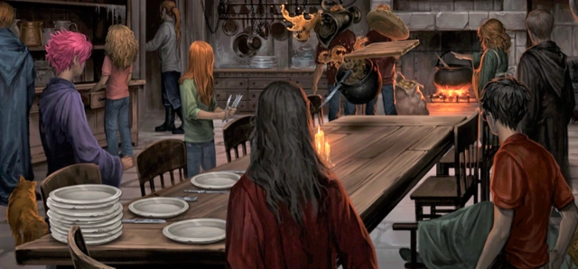 La cuisine se situe au sous-sol, fait la taille d'une caverne et a des murs en pierre brute. Au plafond sont accrochés des poêles et des marmites. Elle contient également un buffet, une cheminée aménagée tout au fond de la pièce et au milieu trône une grande table de bois. Elle semble servir de salle de réunion lors des réunions de l'Ordre du Phénix.[4]