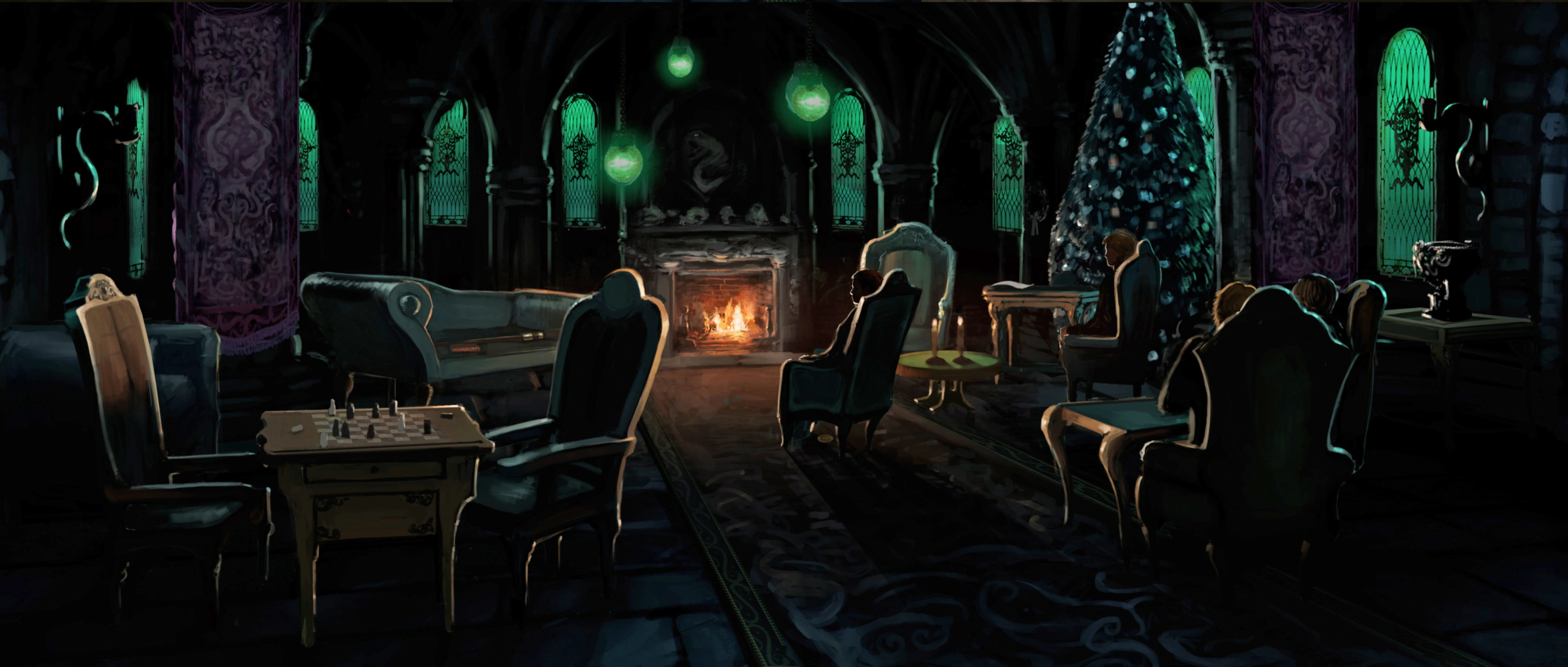 חדר המועדון הוא חדר דמוי-צינוק הנמצא בחלקו מתחת לאגם הוגוורטס, ומעניק לאור בחדר גוון ירקרק. בחדר ספות עור שחורות מרופדות, אח מגולפת, מנורות ירקרקות ולוח מודעות.[2]