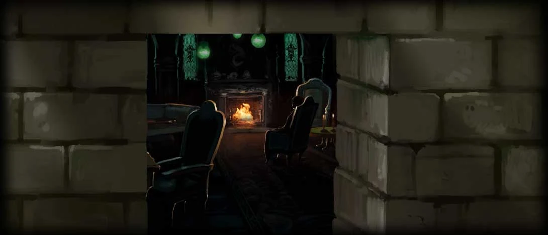 - "חדר המועדון של סלית'רין היה חדר תת-קרקעי עמוק וארוך, בעל קירות אבן מחוספסים ותקרה שממנה נתלו בשרשראות מנורות עגולות וירקרקות. אש פצפצה באח מגולפת היטב, וכמה תלמידי סלית'רין ישבו בכיסאותיהם."