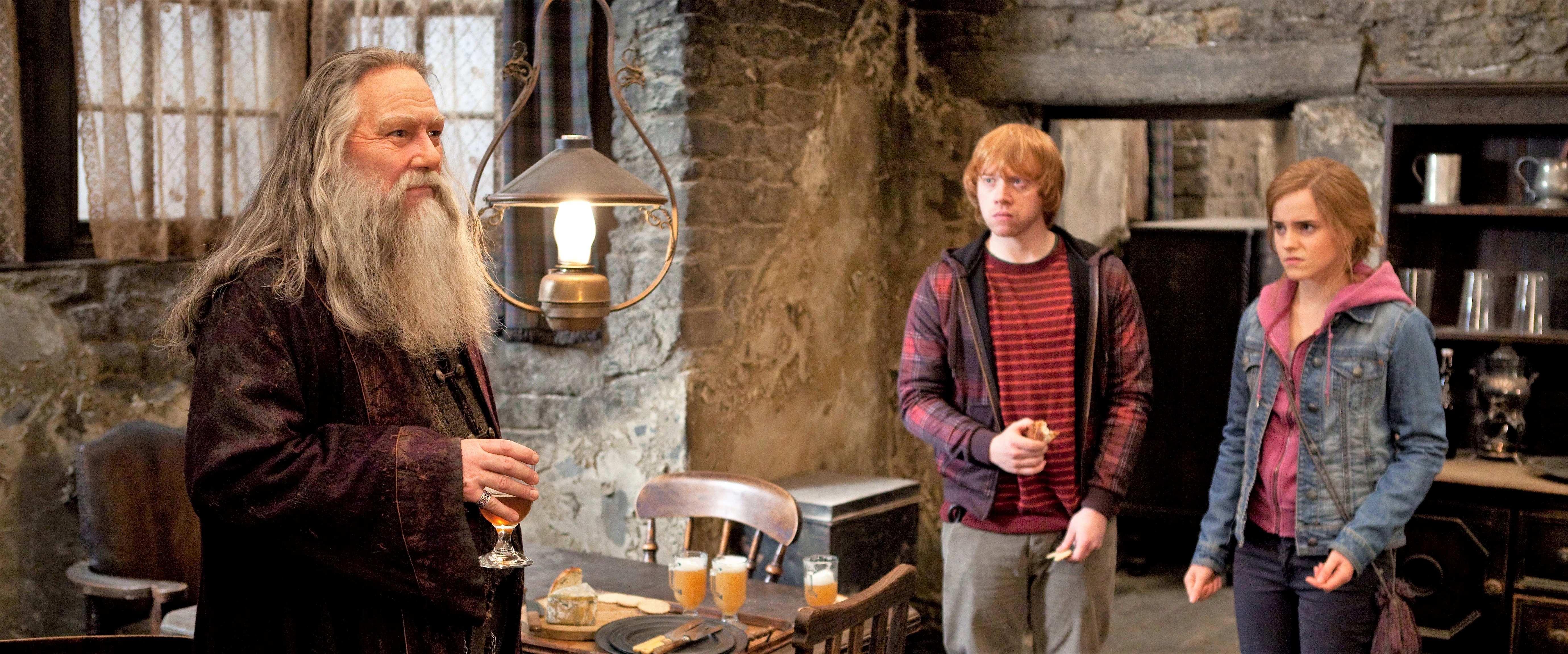 Harry riconobbe Aberforth e lui fu rattristato quando apprese della morte di Dobby che fuggissero dal villaggio la mattina successiva, credendo che l'Ordine della Fenice fosse finito, e Voldemort avesse già vinto la guerra e coloro che stavano ancora combattendo si stessero solo illudendo. Quando Harry rifiutò, dicendo che doveva completare la missione di affidaraglia, Aberforth rimproverò Harry per la fiducia in suo fratello e gli chiese se conoscesse tutta la verità su di lui. Harry, che aveva i suoi dubbi sul suo mentore, non fu in grado di rispondere e Aberforth e raccontò la vera storia di ciò che era successo ad Ariana.[1] Harry però svelò che Albus si era rammaricato per tutta la vita dell'accaduto rivelando che la notte della sua morte, Albus aveva bevuto una pozione che gli aveva fatto rivivere ciò che Grindelwald aveva fatto a suo fratello e a sua sorella.[14]