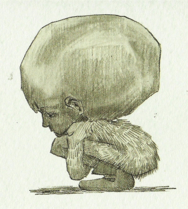 Alto circa trenta centimetri, dal corpo peloso e dalla testa liscia, grigia e molto grossa. Accovacciato somiglia ad un sasso.