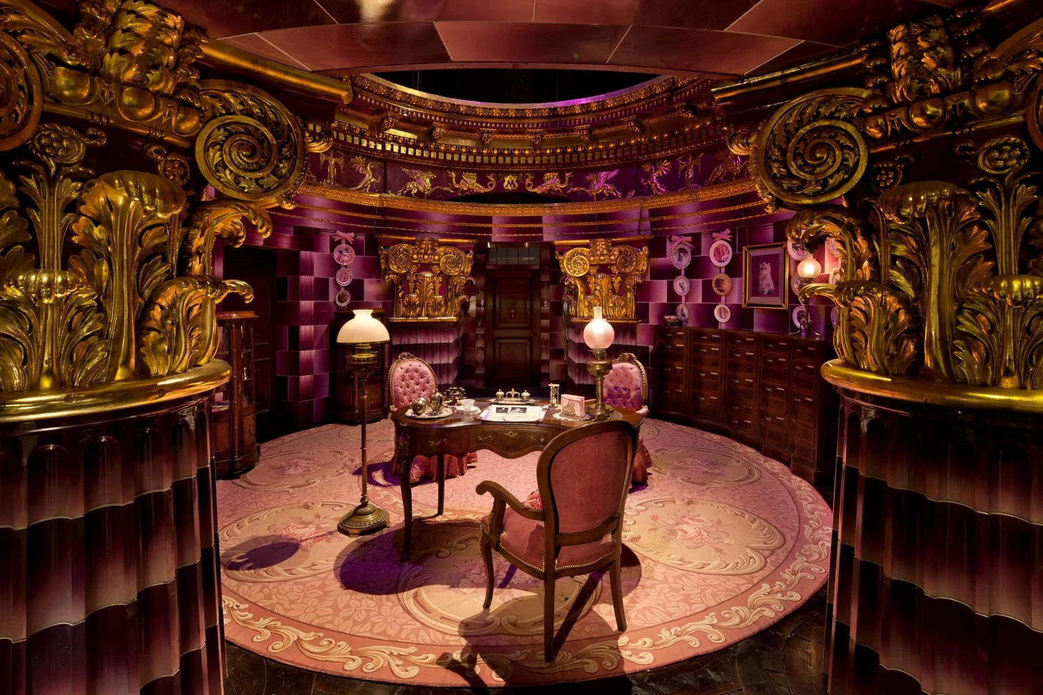 L’intera stanza era dominata dal colore rosa: dalle pareti ai tappeti, dai mobili alle tendine di pizzo che incorniciavano le finestre. Alle pareti erano appesi i celebri piatti dei Felini Felici,[3] mentre centrini e fiori essiccati ricoprivano quasi ogni superficie disponibile. Un grande armadio bianco custodiva una collezione di teiere, mentre al centro della stanza si ergeva una scrivania lucidata con cura, coperta da una tovaglia a fiori. Nei cassetti si trovavano penne d’oca, calamai, nastro adesivo magico e graffette incantate che si avvolgevano come piccoli serpenti. Su un angolo della scrivania, una minuta scatola rivestita di pizzo conteneva fiocchi e fermagli di ricambio, mentre un altro contenitore custodiva la cancelleria rosa, ornata con minuscole figure di gatti sul bordo inferiore dei fogli.[1]