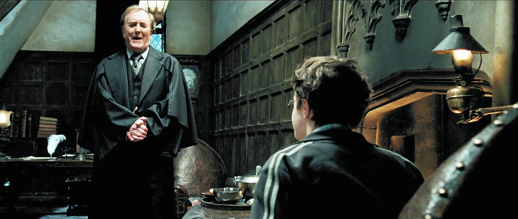Cornelis Droebel praat met Harry Potter in de Lekke Ketel