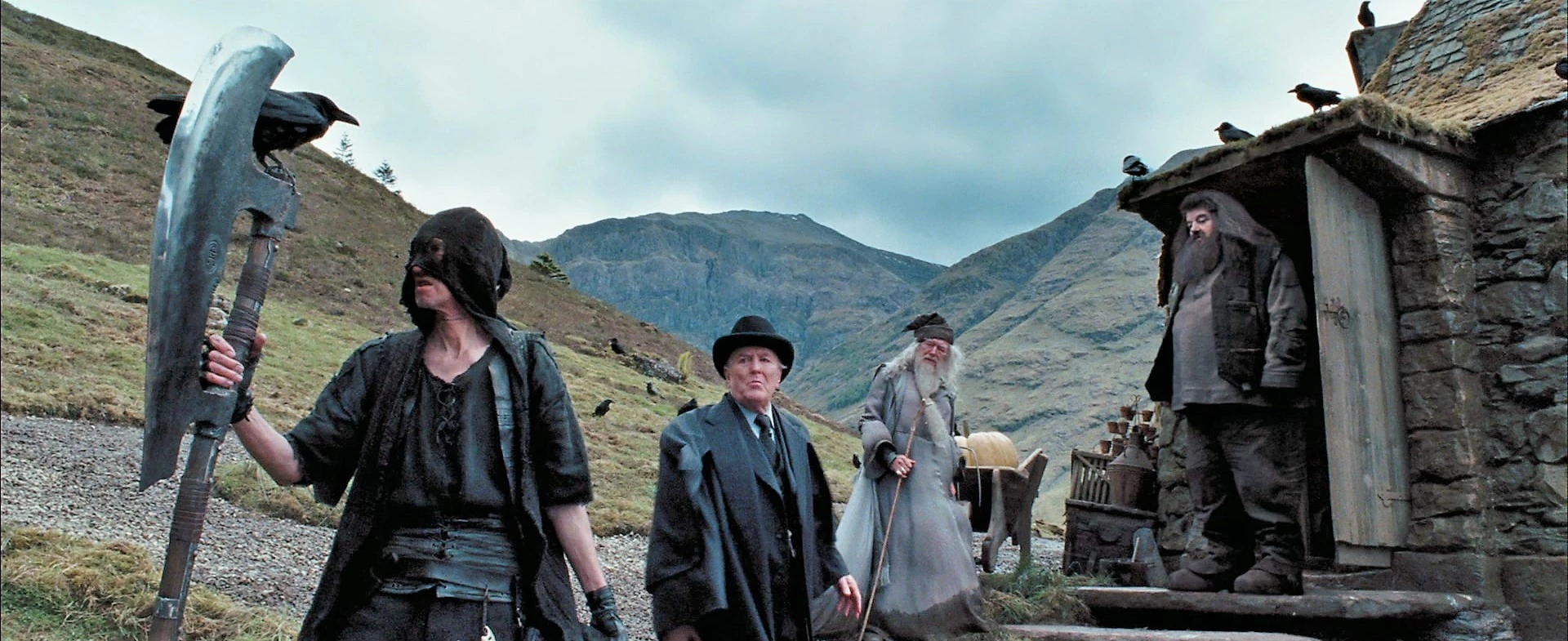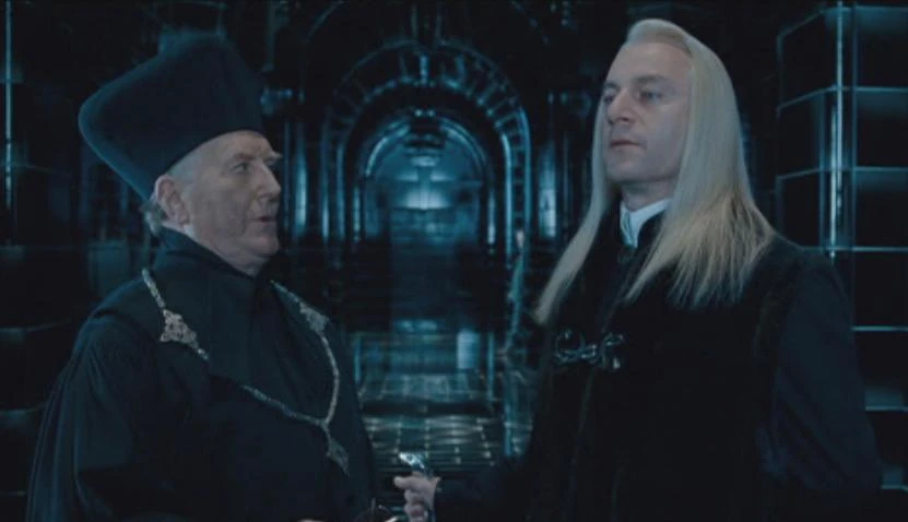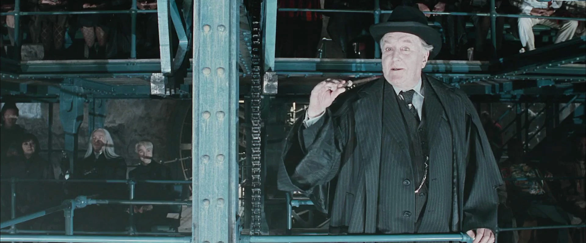 Cornelis Droebel met Lucius Malfidus en Albus Perkamentus tijdens Rubeus Hagrid's arrestatie