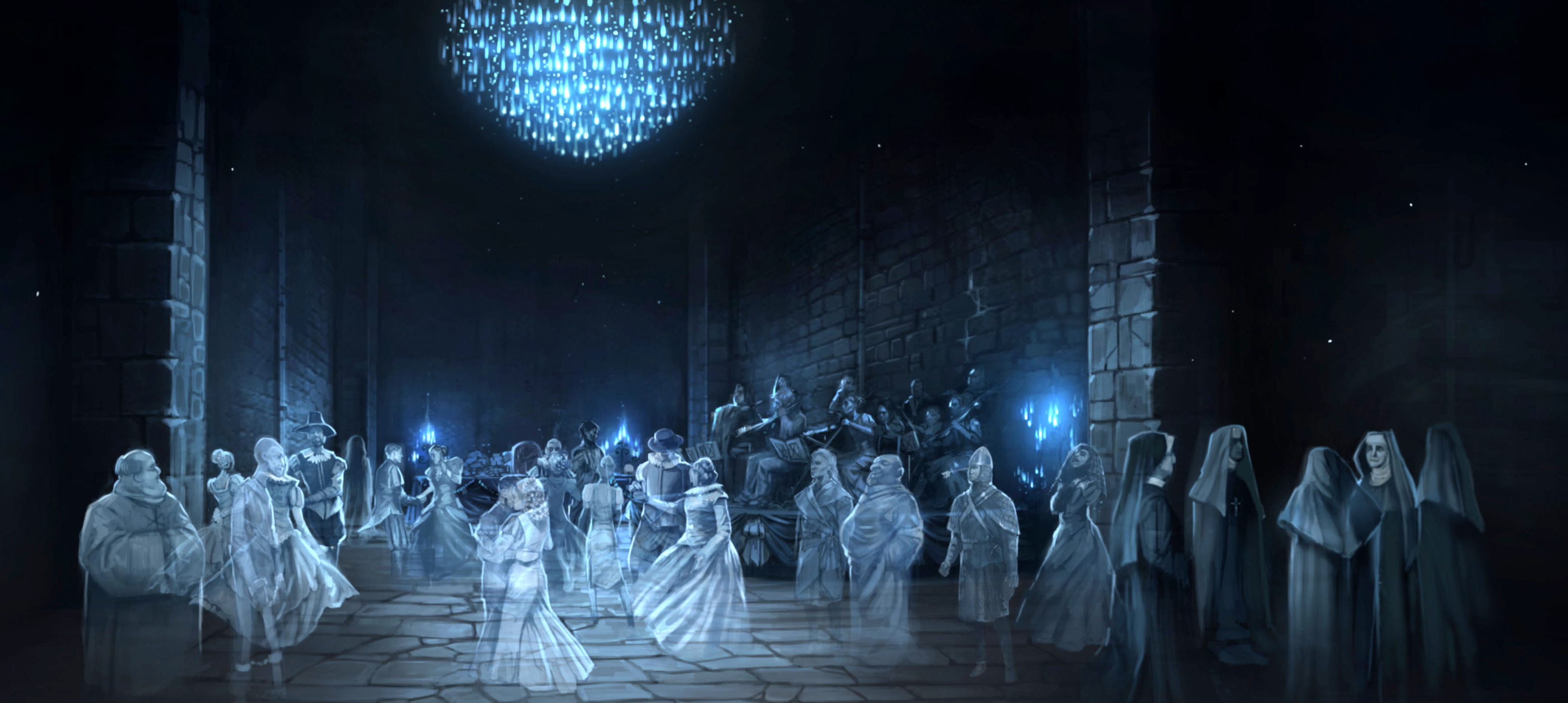 De geesten van Zweinstein op Albus Perkamentus' begrafenis