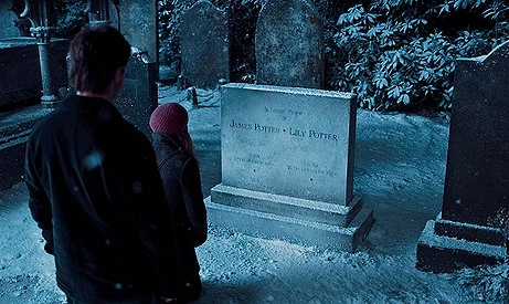 Harry en Hermelien bij het graf van Lily en James Potter