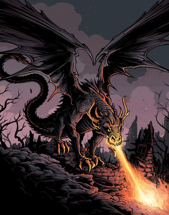 - "En aan de andere kant van de omheinde ruimte zat de Hoornstaart ineengedoken boven haar eieren, met halfgevouwen vleugels en gele ogen die hem boosaardig aanstaarden: een reusachtig, geschubde zwarte hagedis die met haar gehoornde staart zwiepte en meterslange diepe voren in de harde aarde trok."
