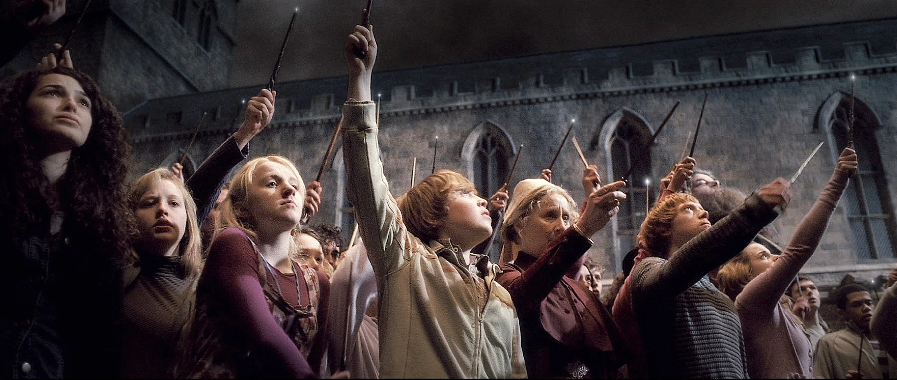 Jorik, Loena Leeflang en Madame Plijster heffen hun toverstok voor wijlen professor Perkamentus