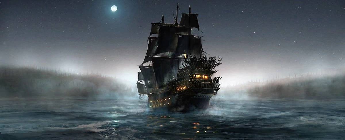- "Traag en indrukwekkend rees het schip uit het water op, glanzend in het maanlicht. Het leek merkwaardig ijl en skeletachtig, alsof het een gelicht wrak was en de doffe, wazige lichten die glimmerden achter de patrijspoorten waren net spookachtige ogen. Met een luid geklots kwam het schip ten slotte helemaal boven water uit, bleef even deinen en gleed toen naar de wal."