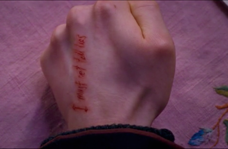 Wanneer Harry in zijn vijfde jaar moet nablijven bij professor Omber, moet hij zijn strafregels schrijven met een speciale ganzenveer, een zogenaamde bloedveer. Deze is lang, dun en zwart en heeft een ongewoon scherpe punt. Harry moet de woorden " Ik Mag Niet Liegen" schrijven, en voelt bij elke letter die hij schrijft een doordringende pijn in zijn linkerhand. De woorden die hij schrijft, worden door deze pen geschreven met zijn eigen bloed en de letters worden op magische wijze in zijn hand gekerfd, zoals is te zien op de foto. De wonden genezen zich echter vanzelf weer, waarna hij ze weer opnieuw moet maken door verder te schrijven. Als je ze maar lang genoeg blijft schrijven geneest de wond niet meer en staan de woorden er voor altijd in gekerfd. Daarom heeft Harry er nu nog steeds een litteken van op zijn linkerhand.