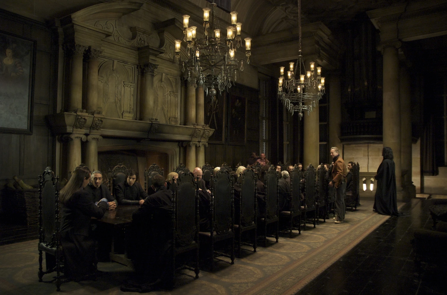 - "Aan het eind van de lange, rechte oprit doemde een fraai landhuis op. Achter de ramen op de benedenverdieping glansde licht. Ergens in de donkere tuin, achter de heg, klaterde een fontein... De hal was groot, schemerig en overdadig ingericht. Een schitterend tapijt bedekte het grootste gedeelte van de stenen vloer en de ogen van de bleke geportretteerden aan de muren volgden Sneep en Jeegers terwijl ze passeerden."