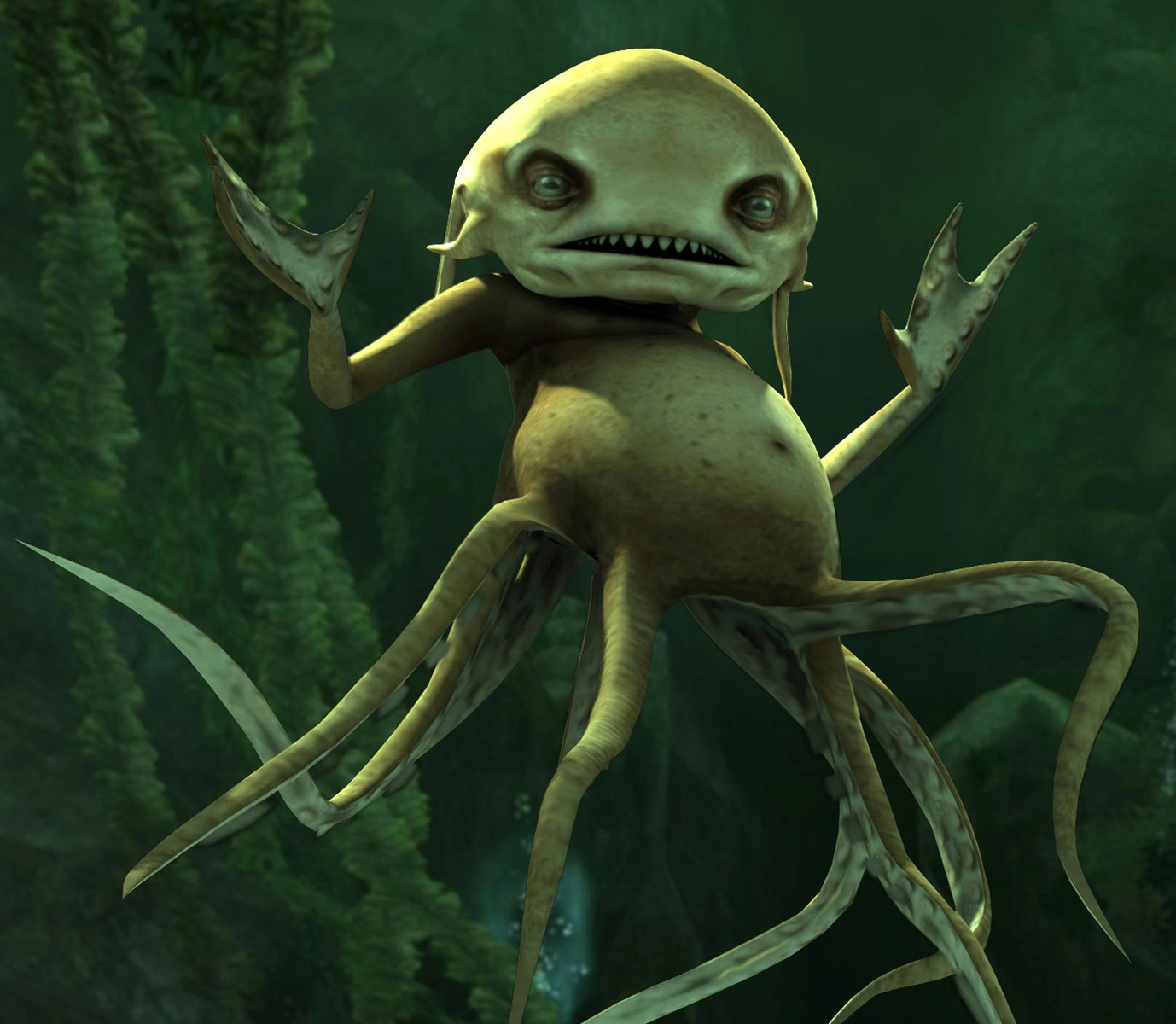 - "Een bleekgroen wezen met scherpe horentjes drukte zijn gezicht tegen het glas, trok gekke bekken en boog zijn lange, dunne vingers."