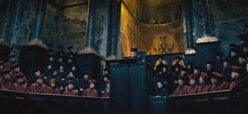 - "Han følte seg ikke særlig vel da han kikket opp på dem som satt på benkeradene over ham. Det var omtrent femti av dem. Så vidt han kunne se var alle iført plommefarget kutte med en kunstferdig brodert 'H' på venstre side av brystet, og alle stirret mørkt ned på ham, noen med streng mine, andre med tydelig nysgjerrighet."