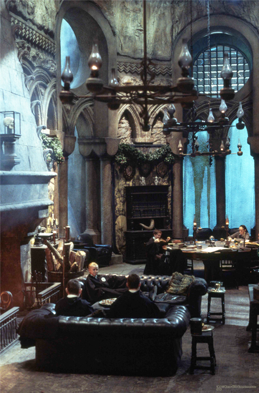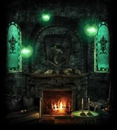 Oppholdsrommet er et langt lavt, underjordisk kammer med vegger og tak av grovhogd stein, og en overdådig utskåret peis. I lenker fra taket henger runde lamper som skinner med et grønnlig lys. Det er innredet med utskjærte møbler av mørkt tre, og lave sofaer trukket med sort og grønt skinn. Veggene er prydet med dødningeskaller og veggtepper som utbroderer hendelser om tidligere berømte smygardinger.