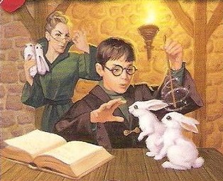 „Harry spojrzał smętnie na parę białych królików, które miał zamienić w bambosze.”