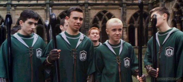 Również reszta drużyny wydawała się mieć takie same poglądy jak on. Można to wywnioskować, po ich reakcji, kiedy Malfoy nazwał Hermionę Granger „szlamą” i roześmiał się, kiedy klątwa rzucona przez Rona Weasleya obróciła się i uderzyła w Gryfona. Reszta drużyny śmiała się i uśmiechała razem ze Ślizgonem.