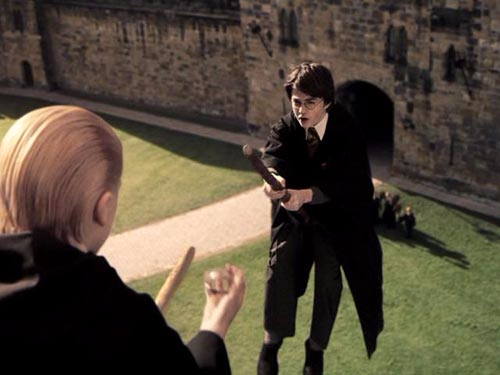 Neville Longbottom na pierwszym roku w Hogwarcie dostał od babci przypominajkę, którą Draco podczas lekcji latania wyrzucił na drzewo. Harry Potter użył miotły by ją odzyskać. Zauważyła to opiekunka Gryffindoru, Minerwa McGonagall, która zamiast ukarać go za używanie miotły bez pozwolenia, zapewniła mu miejsce w drużynie. Draco był wściekły i zazdrosny, ponieważ pomimo młodego wieku, Harry dostał się do zespołu i jednocześnie stał się najmłodszym graczem quidditcha od stulecia.