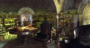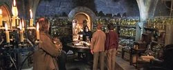 Przy ścianach stały regały, na których znajdowały się duże, szklane słoiki wypełnione nieprzyjemnymi dla oka odczynnikami, takimi jak części zwierząt i roślin, umieszczone w miksturach o różnych kolorach[1][2].