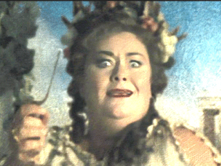 Gruba Dama próbująca rozbić kieliszek śpiewem.