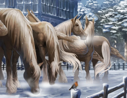 Kolejnymi z grona skrzydlatych koni są abraksany. Mają one jasną skórę, czerwone oczy, białą grzywę, niebieskie pióra i są dużo większe od zwykłych koni. Według słów Olimpii Maxime ich sposób odżywiania jest dość ciekawy, ponieważ piją one tylko niemieszaną whisky. Poza tym stworzenia te wymagają również mocnej ręki. Abraksany wykorzystywane są w Akademii Magii Beauxbatons do ciągnięcia latającego powozu. Przy jego pomocy uczniowie tej szkoły dotarli na Turniej Trójmagiczny. Poza tym konie przywiozły również Olimpię Maxime na pogrzeb Albusa Dumbledore’a. Moim zdaniem ciekawy jest tutaj fakt, że zarówno Beauxbatons, jak i Hogwart używają skrzydlatych koni do transportu, różnicą jest tu tylko rasa i fakt, że kareta Hogwartu nie lata, chociaż co do tego drugiego raczej nie byłoby problemu, aby w razie potrzeby testrale pofrunęły z nią w powietrze.