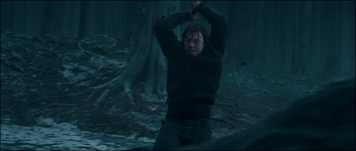 Harry i Hermiona po starciu z Nagini w Dolinie Godryka i wymknięciu się Czarnemu Panu, aportowali się w lasach Forest of Dean. Obozowali przez pewien czas w tych lasach, ponieważ czuli się tam bezpiecznie. Pewnej nocy zmienili się na straży i Harry'emu wypadło pilnowanie ich obozu, w czasie gdy Hermiona spała. Przed pójściem spać przekazała mu horkruks-medalion Salazara Slytherina, którego do tej pory nie udało im się zniszczyć. Siedzący przed namiotem Harry zauważył patronusa srebrnej łani, który zaprowdził go nad brzeg zamarzniętej sadzawki. Tam chłopiec zauważył leżący na jej dnie miecz Gryffindora. Bez większego namysłu rozebrał się i wskoczył do wody. Zapomniał jednak o wiszącym na jego szyi medalionie Salazara Slytherina, który wyczuwając, że Harry chciał zdobyć miecz, będący dla niego-medalionu zagrożeniem, zacisnął się wokół szyi chłopca, próbując go udusić. W tym samym momencie otwór w lodzie zamarzł, sprawiając, że Harry znalazł się w pułapce. Nie mogąc wydostać się z pod lodu, podduszony przez łańcuszek, na którym wisiał medalion, Harry był bliski śmierci. Nagle do wody wskoczyła inna osoba, chwyciła miecz, a następnie wyciągnęła duszącego się Harry'ego na powierzchnię, ratując mu życie. Wybawcą Harry'ego okazał się Ron, jego najlepszy przyjaciel, który odnalazł Harry'ego, gdy ten udał się za srebrną łanią nad sadzawkę. Harry po krótkim wyjaśnieniu Rona, zdecydował, że to Ron z pomocą miecza zniszczy horkruksa, tym bardziej, że to on wyłowił miecz i uratował mu życie. Harry przemówił do medalionu w mowie wężów i ten natychmiast się otworzył. Przed Ronem ukazały się obrazy, które miały złamać jego ducha: zjawy Riddle-Hermiony i Riddle-Harry'ego szydzące z Rona, z tego, że był tym niechcianym synem, pomijanym przez dziewczynę, która wolała jego przyjaciela. Ron jednak nie uległ wizjom medalionu i zaatakował medalion mieczem, łamiąc jego potężną czarnomagiczną moc.