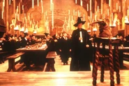 Harry Potter razem z innymi pierwszoroczniakami wchodzi do Wielkiej Sali. Z podziwem ogląda największą, hogwarcką salę. Na początku Tiara Przydziału w uroczystości zwanej ceremonią przydziału rozdzieliła uczniów na cztery domy: Gryffindor, Slytherin, Ravenclaw i Hufflepuff po tym, jak zaśpiewała piosenkę o Hogwarcie. Harry Potter ku swojej ogromnej uldze trafił do Gryffindoru. Do tego samego domu trafił Ron, Hermiona i Neville Longbottom. Następnym etapem uroczystości początku roku szkolnego była zadziwiająca przemowa Albusa Dumbledore'a. Na końcu na stołach pojawiło się jedzenie i zaczęła się uczta.