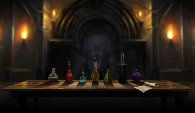 Ao entrar nessa câmara, a entrada era bloqueada por chamas roxas e a saída por chamas negras. Uma mesa contendo sete garrafas de poções sem rótulos, de diferentes tamanhos e formatos, encontrava-se no centro, com um enigma lógico. Três continham veneno, duas continham vinho de urtiga, uma continha uma poção que permitiria atravessar as chamas negras e a última uma poção que permitiria atravessar as chamas roxas. O enigma, se solucionado corretamente, revelava os conteúdos de cada garrafa e consequentemente qual era segura para se beber e então progredir.[1] |