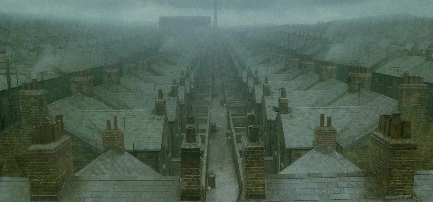 - "...Lado a lado, elas pararam, examinando na escuridão as fileiras de casas de tijolos aparentes, em ruínas, as janelas opacas e sem luz."