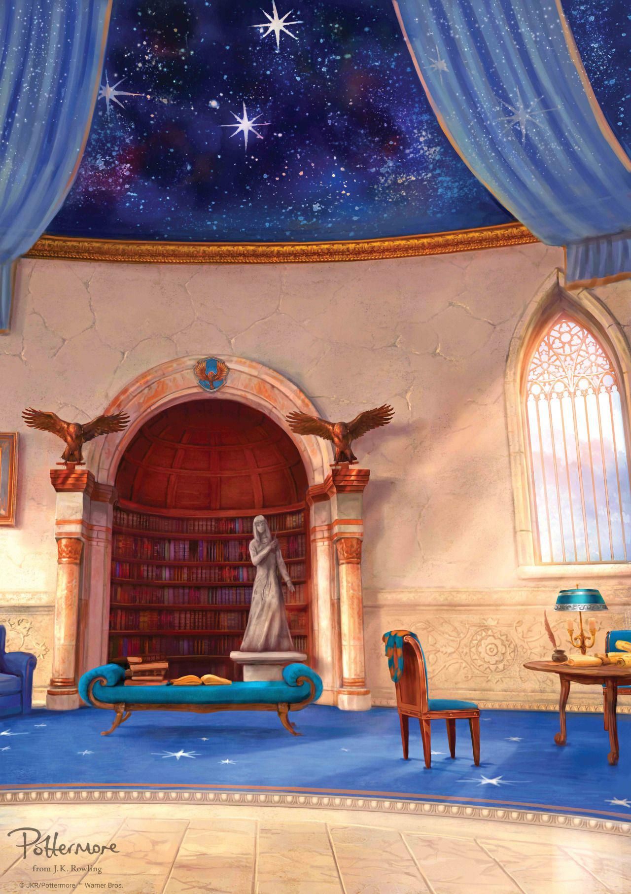 "A deserta sala comunal da Corvinal era ampla e circular, mais arejada do que qualquer outra que Harry já vira em Hogwarts. Graciosas janelas em arco pontuavam as paredes, ladeadas por reposteiros de seda azul e bronze; de dia, os alunos deviam ter uma vista espetacular das montanhas ao redor. O teto era abobadado e pintado com estrelas que se repetiam também no carpete azul-escuro. Havia mesas, poltronas e estantes e, em um nicho na parede oposta à porta, uma alta estátua de mármore branco."