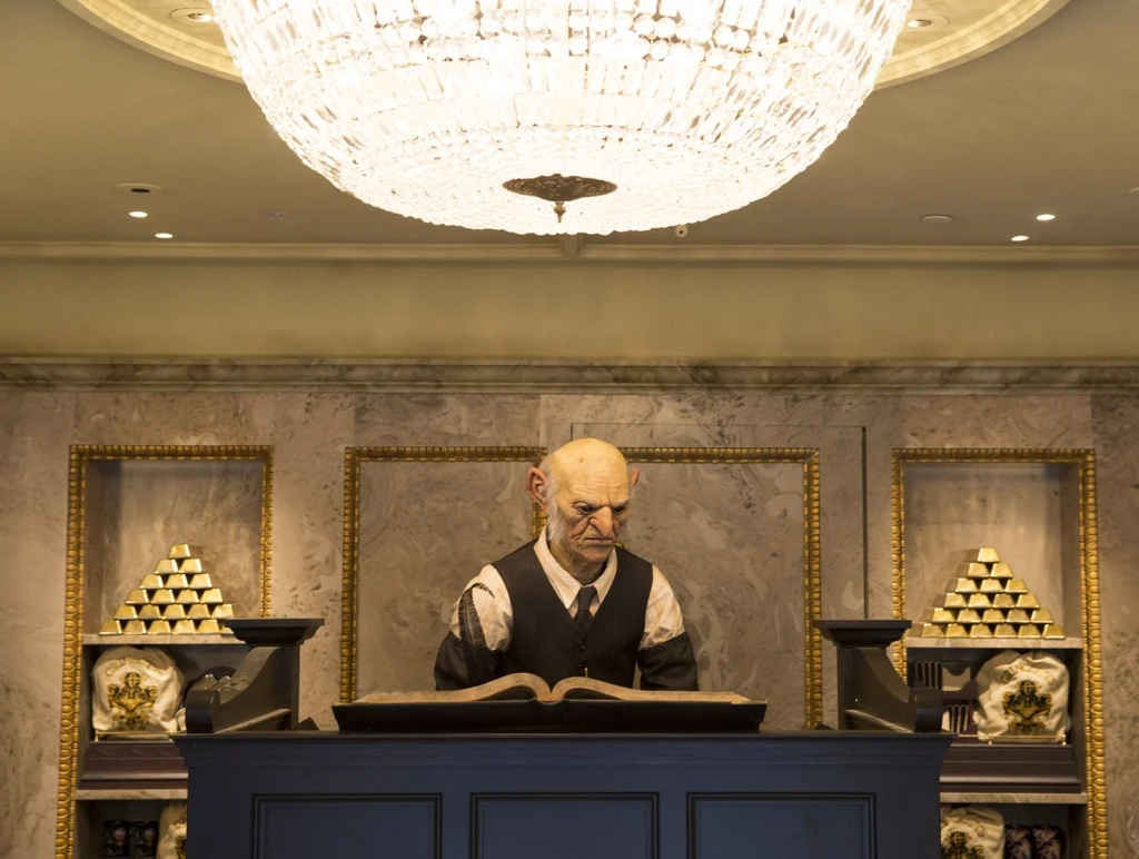 Также здесь можно приобрести шоколадные монеты, кошельки и мешки, различные предметы с символикой Гринготтса, сувенирные ключики от сейфов и др. В заведении сидит автоматизированный гоблин, с которым можно взаимодействовать.