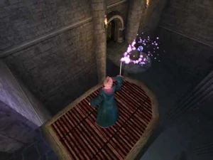 С этой платформы прыгните обратно на ближайший уступ, затем прыгните к двери, и там вы найдёте Книгу сохранения. В следующей комнате вас ждёт первое сражение с чёртиком, так что приготовьтесь. После того, как вы уничтожите первого чёртика, из тайной ниши появятся ещё двое. Уничтожьте их, тогда откроется платформа Спанджифай, и проём в потолке. Перед тем, как покинуть это помещение, не забудьте применить Алохомора на оба шкафчика у стен.