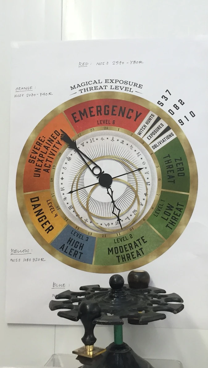 Оно работает как барометр, только вместо давления, в нём измеряется уровень опасности разоблачения волшебников США не-магами. Маленькие стрелки передвигаются между уровнями угроз: зелёное — для низкого уровня опасности, синее — для высокого, жёлтое — для страшной необъяснимой активности, красное — для чрезвычайных ситуаций.