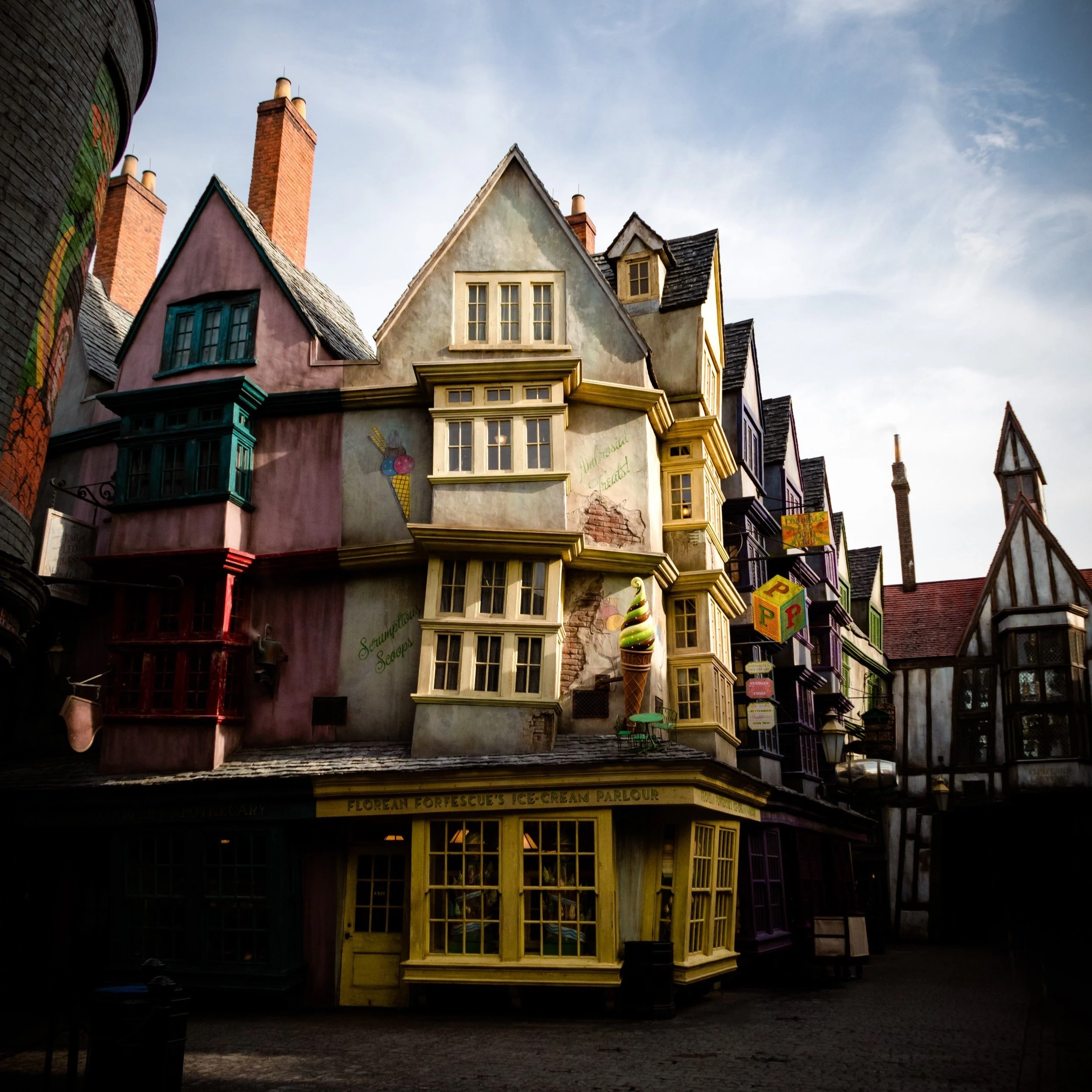 В 1996 году витрина кафе, как и многие другие лавки в Косом переулке, была «заколочена досками».