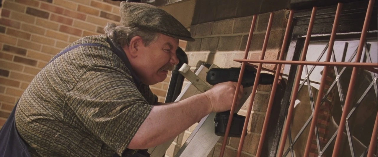 Дядя Вернон ставит решётку на окно комнаты Гарри