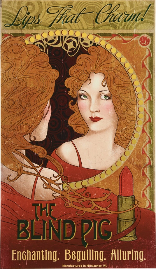 Вход в спикизи был магически скрыт заколдованным рекламным плакатом с надписью «Чарующие губы» (англ. Lips That Charm!). Следовало постучать по плакату условным стуком — и появлялась прорезь для глаз. Вышибала оценивающе осматривал пришедших.